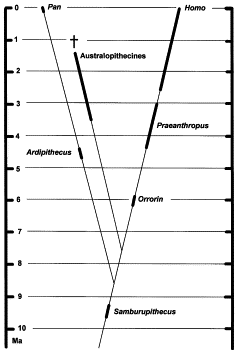 The authors conclude that on the basis of dental and postcranial morphology, it appears that Orrorin belongs to the hominid lineage, which was already present 6 million years ago. They suggest this confirms the hypothesis that the divergence between apes and humans took place prior to 6 million years ago, and probably between 9 and 7 million years ago, as they show in the diagram to the right. In this diagram, Ardipithecus ramidus is the ancestor of Pan and the Australopithecines an extinct line -- a view at odds with the view of most paleoanthropologists (cf. family trees and Ardipithecus ramidus). For an impression of the early discussion, see Michael Balter, Scientists Spar Over Claims of Earliest Human Ancestor, Science 291 5508 (23 Feb 2001): 1460-1461 (full text, external).